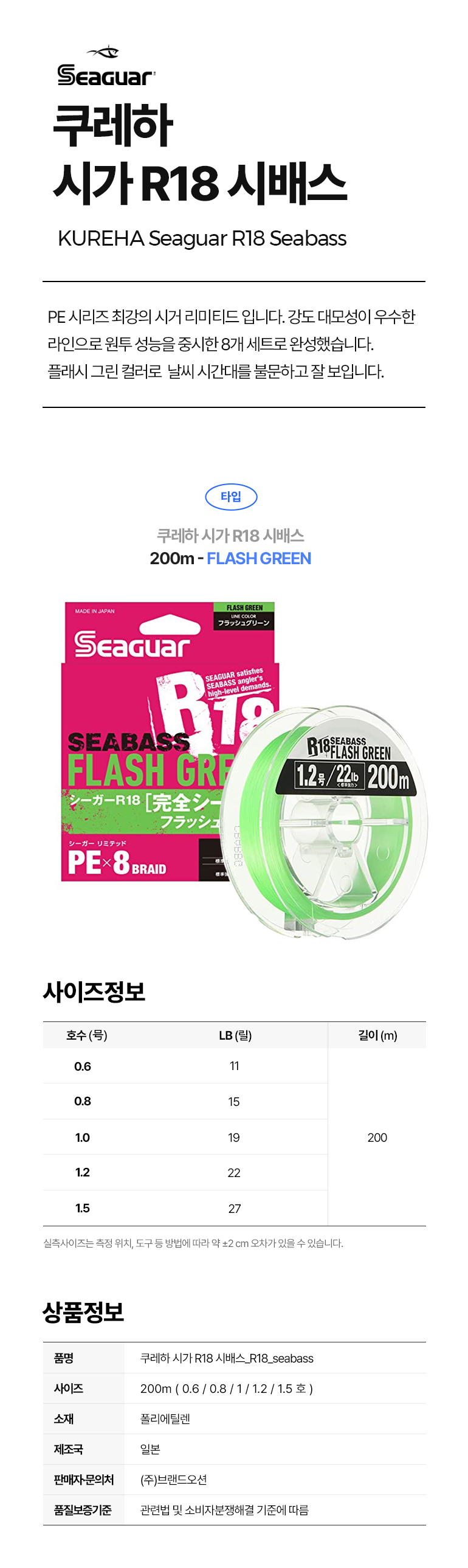 쿠레하 SEAGUAR R18 SEABASS 플래시그린 8합사 200M